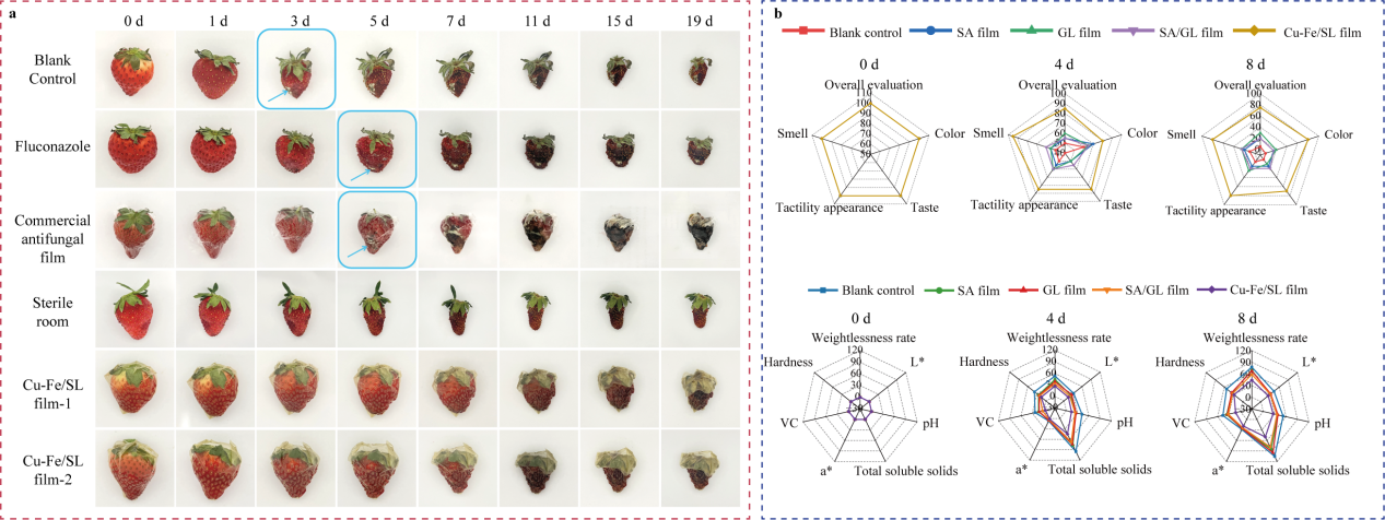 为满足实际食品包装应用需求,研究团队将Cu₈Fe₂ NCs与海藻酸钠(SA)、明胶(GL)复合,制备出Cu-Fe/SL多功能复合膜。该复合膜利用SA与GL之间的氢键作用增强机械性能,通过CuFe NCs构建的“曲折扩散路径”降低水蒸气渗透率,实现保湿与抗菌功能的协同优化。草莓保鲜实验结果显示,Cu-Fe/SL膜包裹的草莓在室温条件下可保持新鲜状态超过19天,重量损失率显著降低,且感官品质(硬度、色泽、风味)与营养成分(维生素 C、可溶性固形物)得到有效保留。与传统抗菌膜相比,Cu-Fe/SL膜的生产成本降低 80%,每平方米仅需0.87美元,具备极强的产业化应用前景。